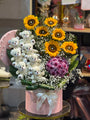 This Gift Basket blends vibrant sunflowers symbols of joy, warmth, and positivity with a cluster of adorable teddy bears, representing comfort, affection, and love. The soft pink hatbox and delicate white ribbons add a tender touch, making it perfect for expressing cheerful affection like sending sunshine wrapped in hugs.