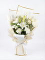 Embodying pure sophistication, Ivory Grace stands tall with fragrant white lilies and classic roses. Wrapped in white paper with elegant gold borders, it is a vision of peace and luxury.