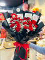 A bold bouquet of deep red roses wrapped in elegant black paper, tied with a silky red ribbon — symbolizing love, depth, and timeless devotion. This dramatic design makes every gesture unforgettable.