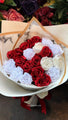 This bouquet of deep red and pure white roses radiates a message of passionate love wrapped in sincerity. The red symbolizes deep affection and desire, while the white balances it with purity and peace — together, they create a timeless harmony of emotion. The smooth satin-like texture of the petals gives it an elegant, almost whispered luxury, hence the name.