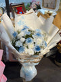 A breath of fresh air. This serene bouquet features rare blue-dyed chrysanthemums mixed with pristine white blooms and delicate baby’s breath (gypsophila). Wrapped in crisp white paper with gold accents, this arrangement symbolizes trust and peace. It is an ideal gift for a newborn baby boy or to bring calm to a loved one's day.