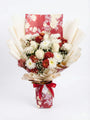 Capture the beat of your heart with Ruby Rhythm. This bouquet mixes the innocence of white roses with the passion of deep red chrysanthemums, all held together by unique, floral-patterned red wrapping paper.